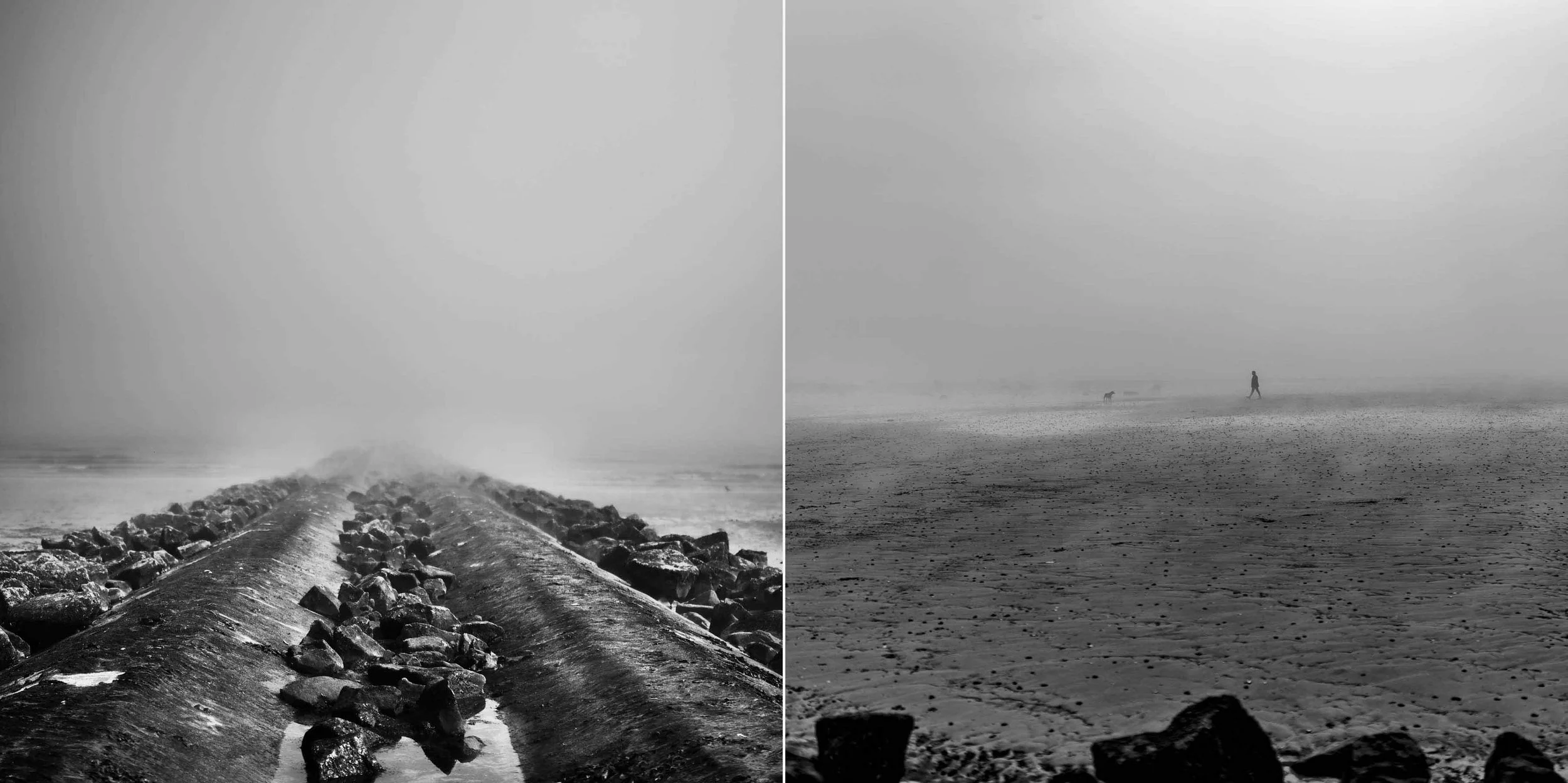 I love photographing Haar. It changes everything. Shapes blur. Light melts. Shadows disappear. The world looks different—almost like another time, another place. Seafield and Portobello are my to go spots. The Haar comes in thick there (mostly). The mist envelops the sand and moves between the rocks. People vanish into it, then reappear. Like ghosts.